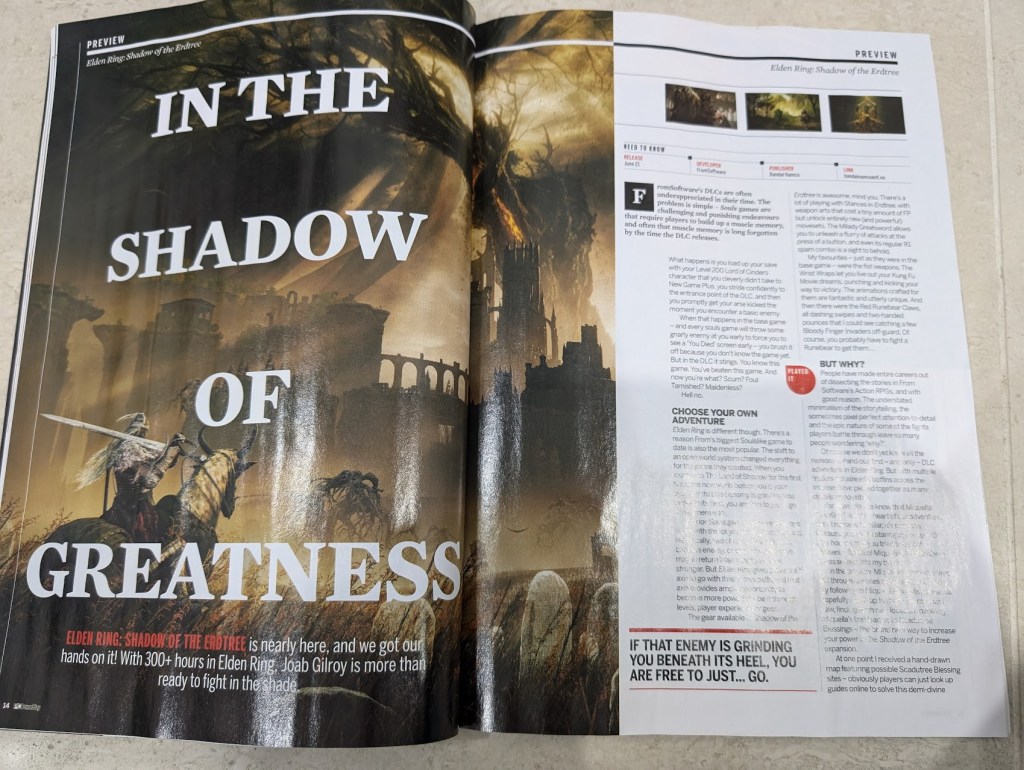 Anyway I bring all this up because Elden Ring’s Shadow of the Erdtree expansion is out and I am obsessed with it. I previewed it for PC PowerPlay and I’ve been mainlining it all weekend. I think I’m ahead of Brando Sando. I don’t yet know how Timothy Zahn is doing at it. I assume George RR Martin, having written the lore for the game (or at least some of it), is not playing.